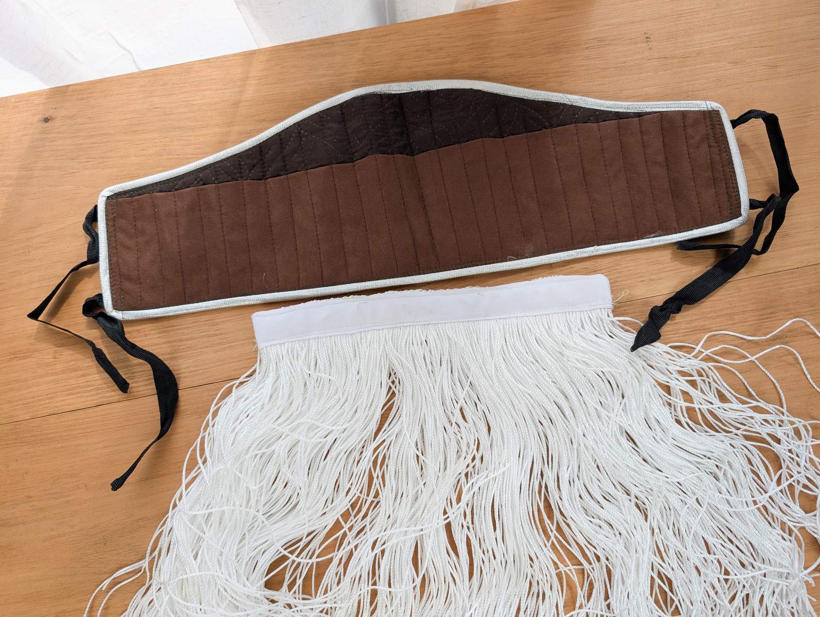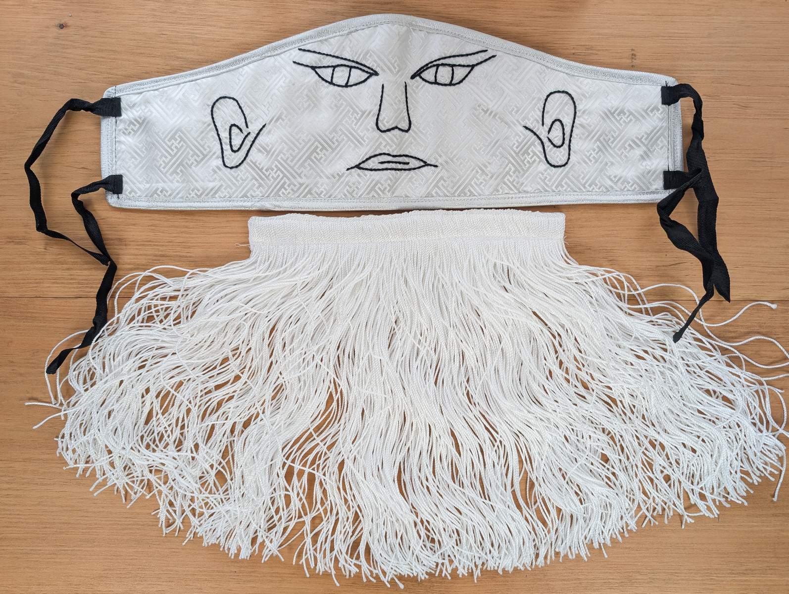 A set of a white shaman hat and white beard to serve as the base of a shaman headdress. Both pieces are made in Mongolia and ready to be customized and finished to your liking. It includes the Maihavach (beard) and Kharavach (hat with face). The beard will need to be sewn onto the mask or attached to another piece of the costume to stay on on the wearer.