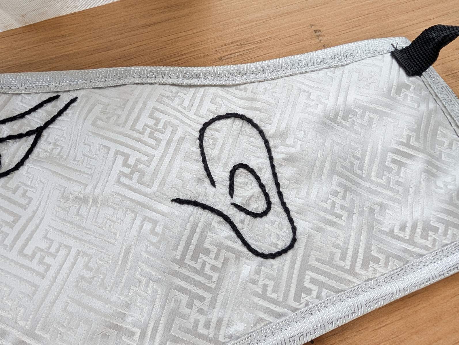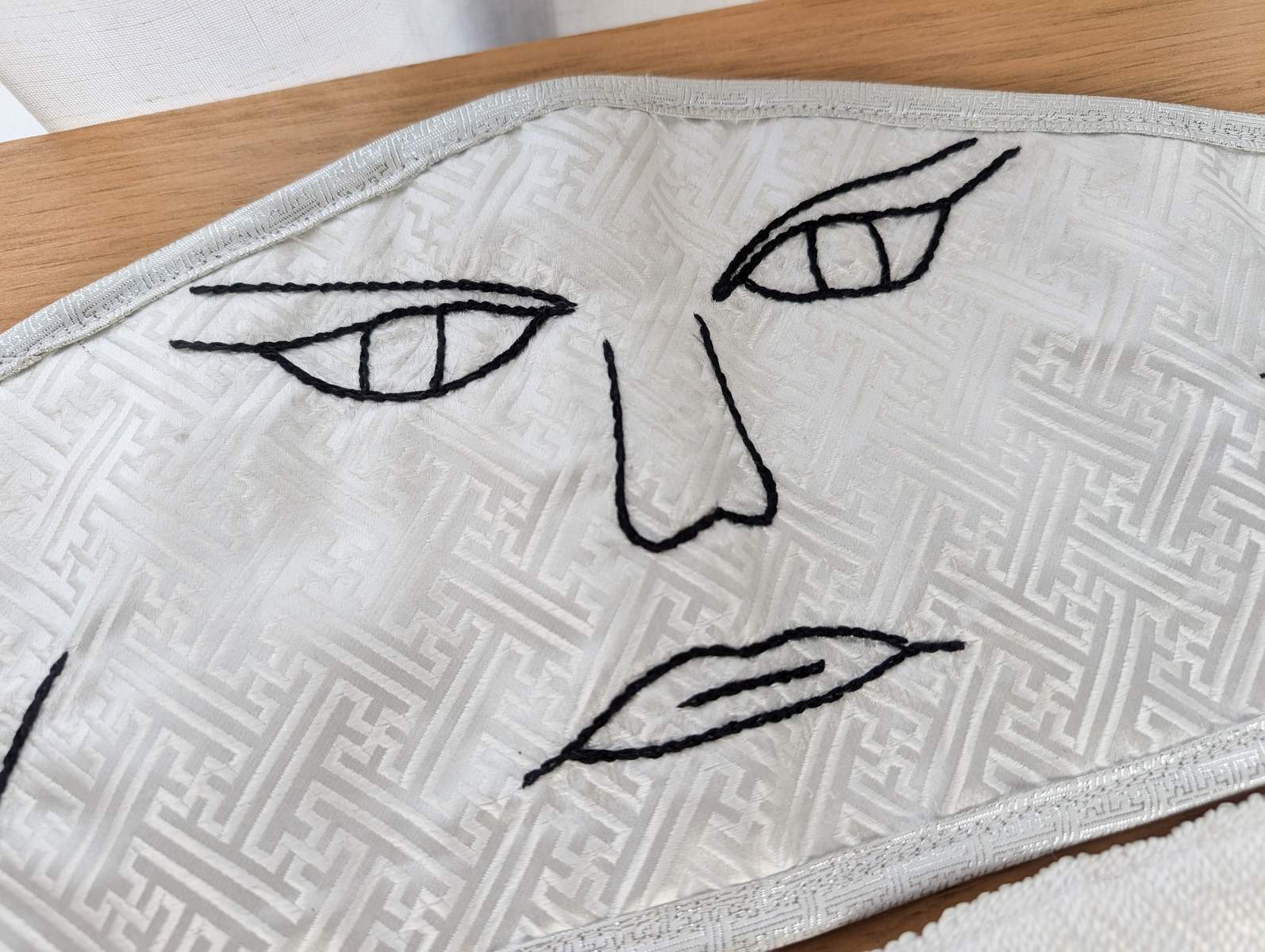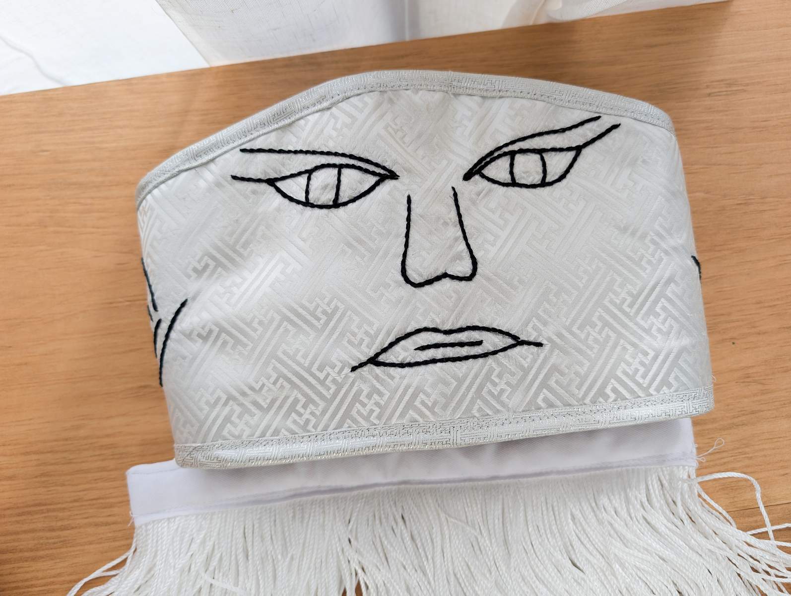Kharavach (the hat) – A mask/hat with face embroidered onto it which serves as the face for the shaman for the outside world while his is hidden behind the beard. It has two ties in the back to secure it around the top of your head.