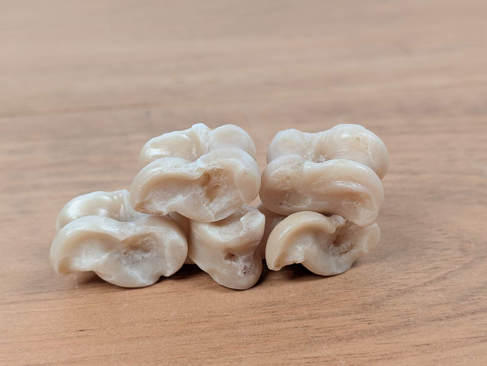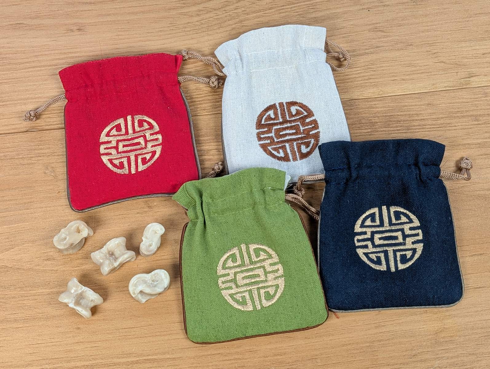 These specific bones and pouches were both sourced directly from Mongolia. Scientifically, they are called the astragalus bone but often called Knucklebones.